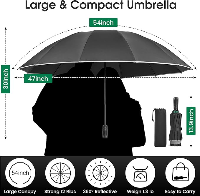 - 【Super Windproof Umbrella with 12 Reinforced Ribs】 This windproof umbrella has 12 strong fiberglass ribs and reinforced rib's joints. And the shaft is made of steel. The ribs of the umbrella will not be easily broken, and the canopy will not be blown over into a "bowl" by the wind. Keep you calm in the storm and avoid the awkward scene caused by a broken umbrella.
