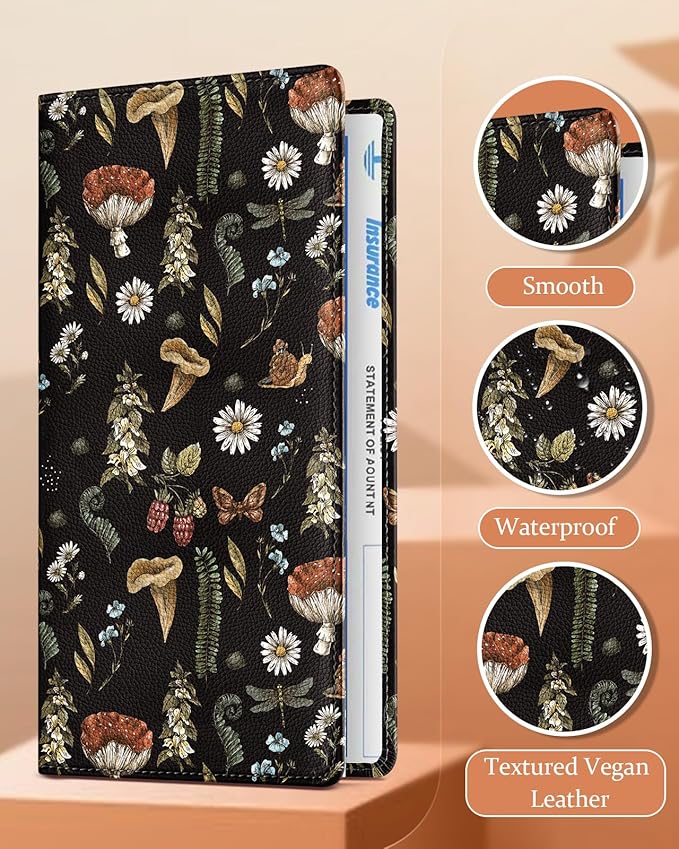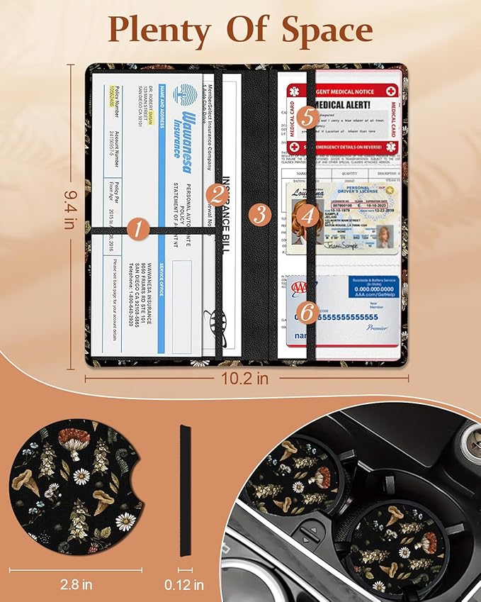 Slohif Car Registration and Insurance Card Holder with Magnetic Shut - Vehicle Glove Box Organizer Women Leather Automobile License Holders Coasters Auto Accessories Case for Document,Mushroom