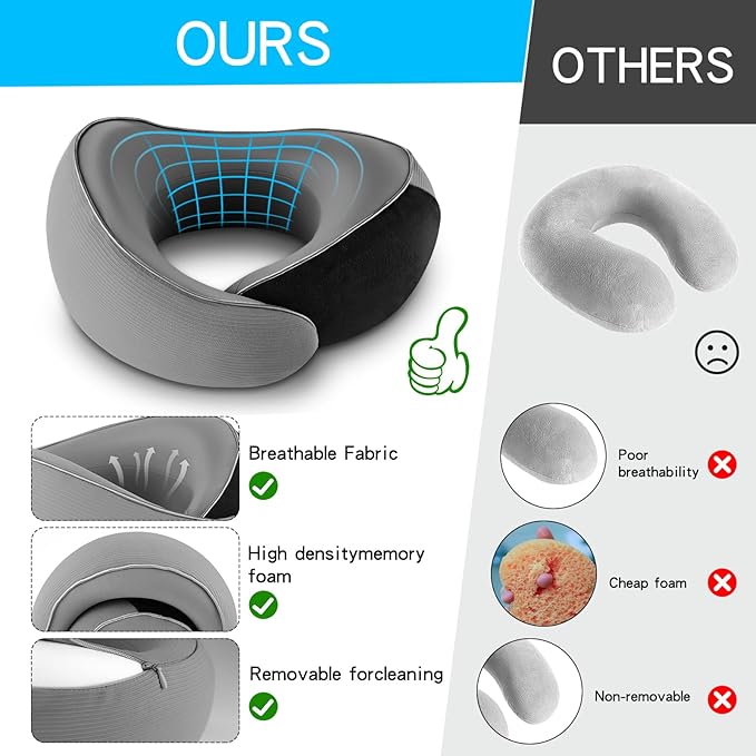 - High-Quality Memory Foam Core: Our U-Shaped Travel Pillow features a premium memory foam filling that molds to the shape of your neck and shoulders, offering personalized support. The slow-rebound technology ensures the pillow retains its original form, providing consistent comfort and stability for long-term use.