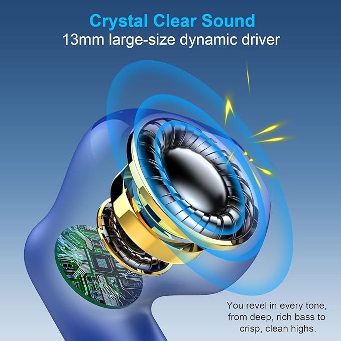 - The impressive Hi-Fi stereo sound and clear call: The wireless headphones feature 13mm drivers that boost quality sound with deep bass and mids at optimal levels that are pleasing to the ears. You will feel like an immersive concert. The built-in mic in each bluetooth earphones utilizes call noise cancellation to ensure clear and realistic sound. It will allow you to enjoy high-quality conversations anytime, anywhere.