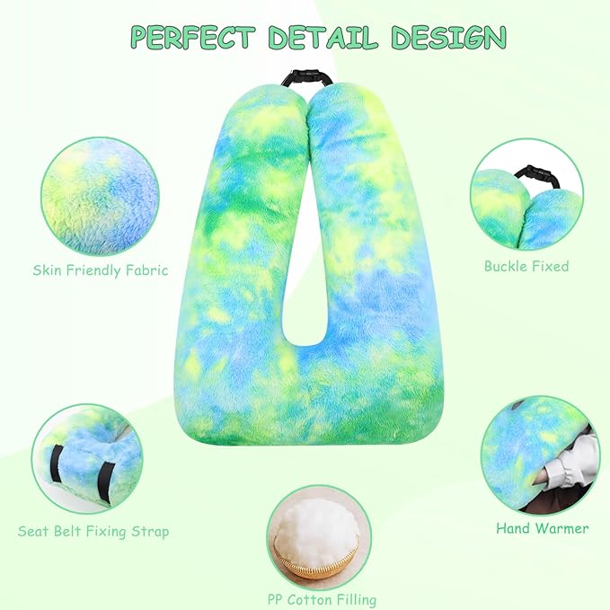 Kids Travel Pillow for Car Seat with Hand Muff, Cartoon Neck & Headrest Seat Belt Pillow for Car Road Trips Long-Distance Travel Sleeping Pillow for Adults and Children, Tie-dye - Green Field