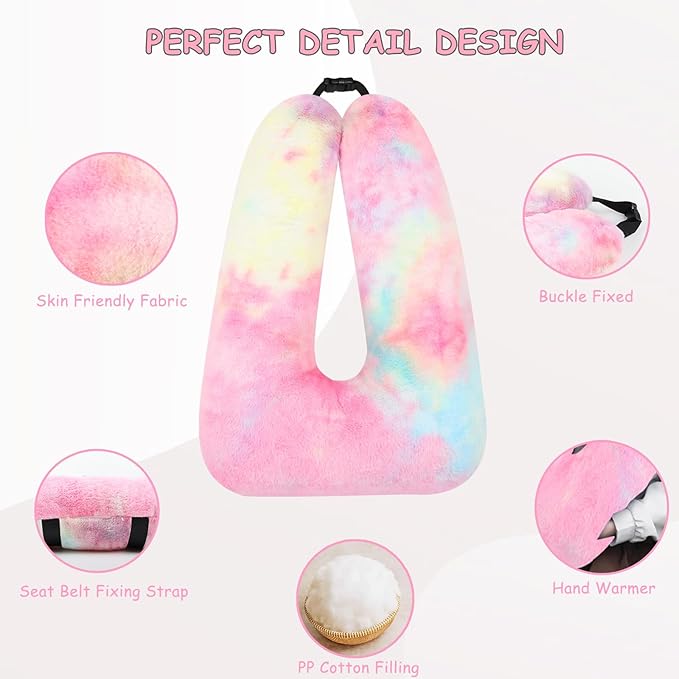 Kids Travel Pillow for Car Seat with Hand Muff, Cartoon Neck & Headrest Seat Belt Pillow for Car Road Trips Long-Distance Travel Sleeping Pillow for Adults and Children, Tie-dye - Rainbow Pink