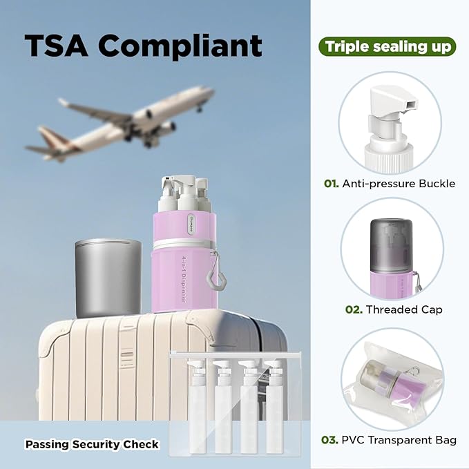 - >Safe and high quality material: The dispenser bottle in the travel set is made of high quality PP material, does not react in any way with toiletries, cosmetics, etc, prevents your expensive items from having to evaporate while you are traveling.