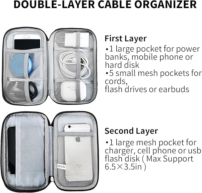 - Double Layers Charger Organizer: Cable organizer box with 2 layers interior compartment has enough space to storage cords, cables, USB drive, cellphone, charger, flash drive, and other accessories.