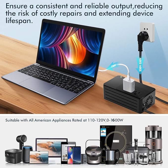 - A pioneering product that dramatically reduces a converter's weight in a revolutionary way. Our upgraded 1600W Voltage Converter transforms 220-250V, 50/60Hz, to a stable 120V pure sine wave, perfectly suited for American electronics and appliances, including high-power devices like hair dryers, coffee makers, and induction cookers.
