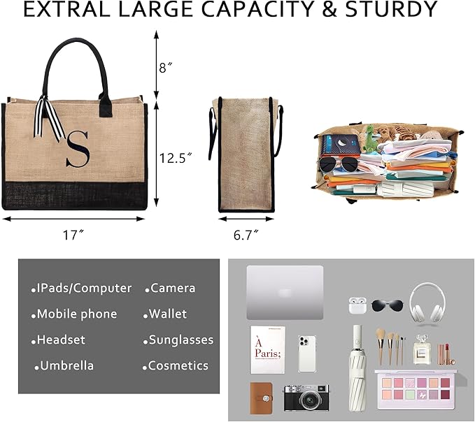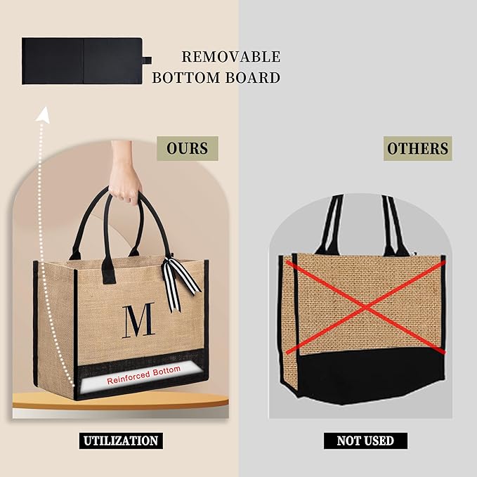 - Premium Burlap & Durability: Crafted from natural burlap with a laminated interior coating, this tote bag preserve your belongings from water, whether at the beach or during outdoor adventures. The removable bottom insert ensures the bag stands upright, while reinforced seams and soft canvas handles provide comfort and durability.