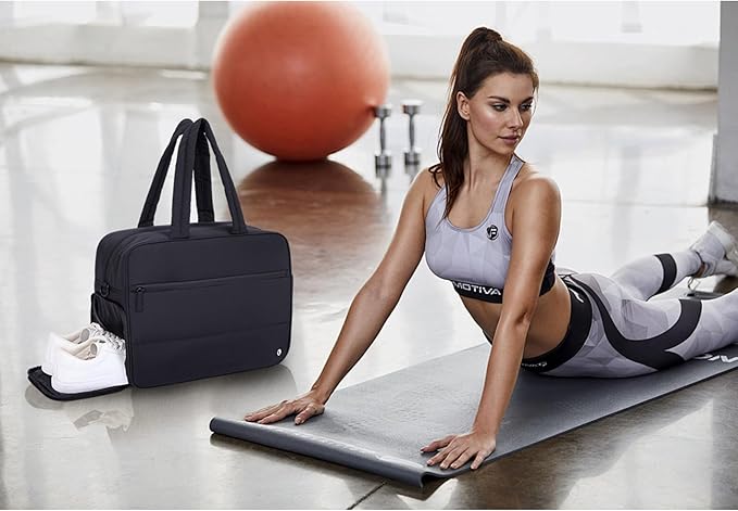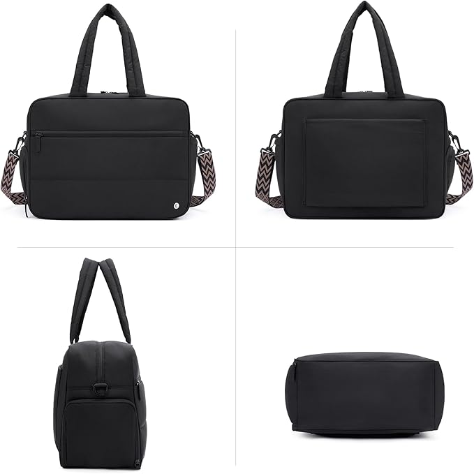 - 【Large Capacity】17.23(L)*13.39(W)*7.09(H) inches, handle drop is 9.45", long strap is 15.55"- 27.95" (adjustable), 1.65 pounds. This puffer tote bag contains 1 main compartment, 2 inner insert pockets, 1 inner zipper pocket and 1 front zipper pocket, 1 side pocket and 1 shoe compartment. It fits your laptop, toiletry bag, or other daily essentials, and is perfect for your carry on when traveling. Also it is worth mentioning that the size of this bag conforms the flight requirements