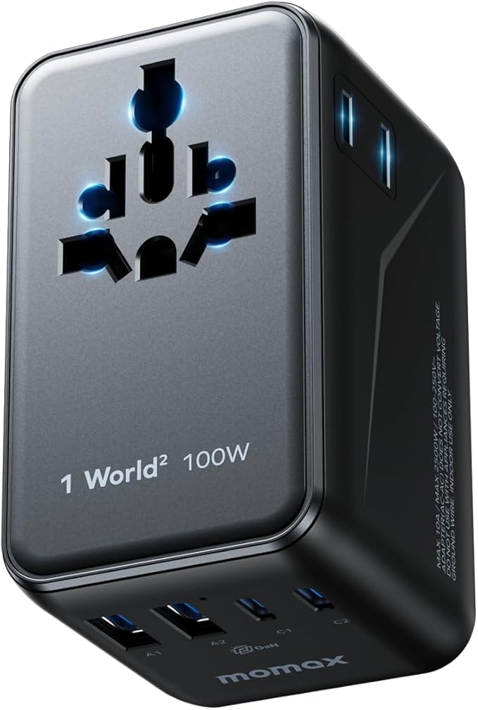 MOMAX 6-in-1 Universal Travel Adapter, GaN 100W International Power Adapter, 2 AC, 2 USB-C PD Fast Charging & 2 USB-A QC, All-in-one International Plug Adapter for Travel European UK AUS JP
