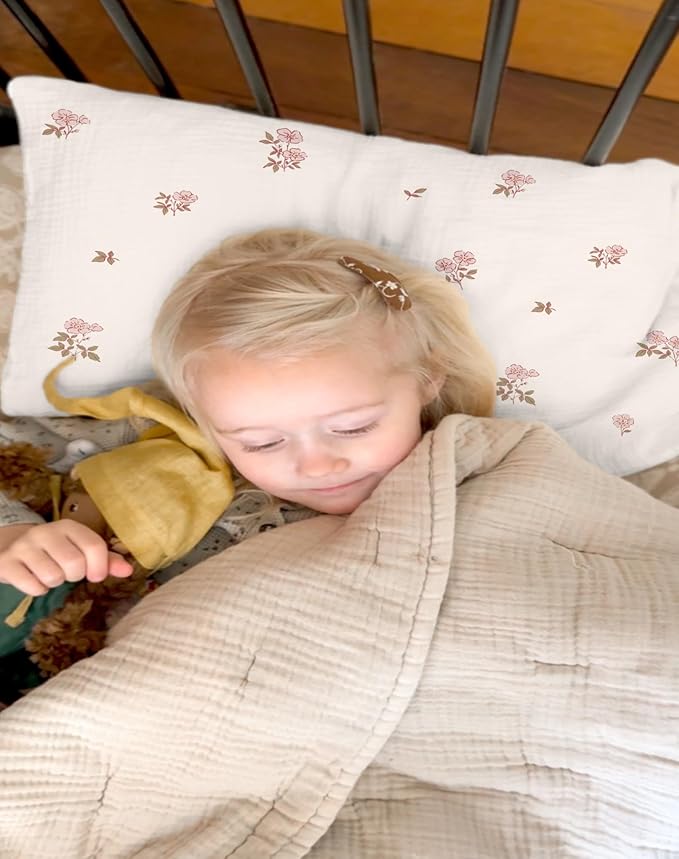 - Premium Fabric: Our toddler pillowcase is made from high-quality muslin fabric, soft and breathable, suitable for all skin types, including sensitive skin. The muslin fabric not only offers excellent breathability but also prevents skin allergies and irritations, ensuring your child stays cool and comfortable during sleep.