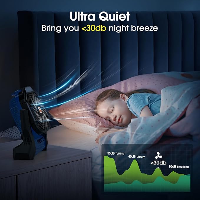 - 4 Adjustable Wind Speeds for Quiet Enjoyment:This battery camping fans features four adjustable wind speeds to cater to your varying needs, keeping you cool whether at home or on camp trips. Utilizing the latest brushless motor technology and high-performance ultra-thin fan blade design, it maintains noise levels below 30dB, allowing you to peacefully sleep in a quiet tent or focus on work while enjoying the perfect balance of tranquility and coolness