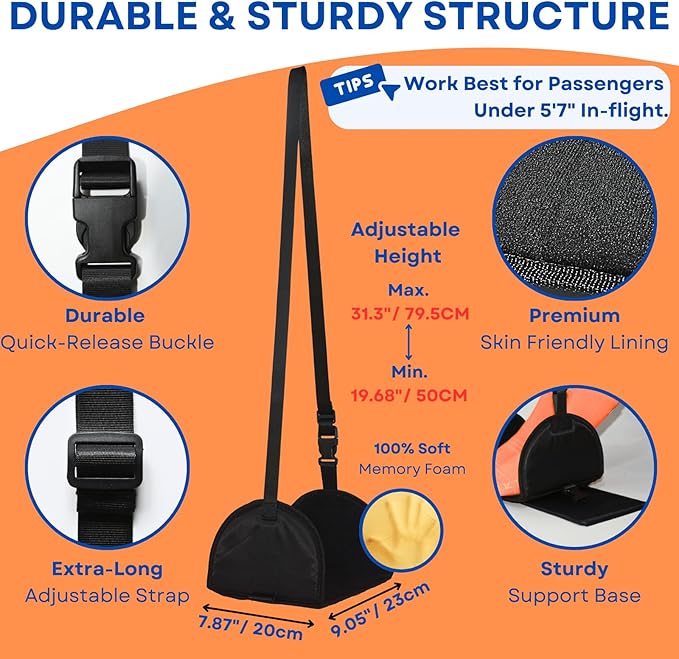 - Upgraded Foot Hammock – Enjoy custom leg support with our airplane foot hammock’s extra-long adjustable strap, extending from 19.68" to 31.3". Whether you’re tall and need to lift your feet off the floor, or shorter and feeling strain in your legs, this travel essential provides perfect relaxation for most heights on long flights. Built with a durable nylon strap and a rigid solid base, this footrest stays steady while reducing soreness and pressure for a more comfortable travel experience.