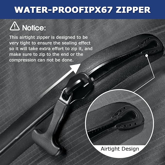 - 【IP67 Waterproof Zipper】This vacuum compression bag features a high-quality IP67-rated airtight zipper, designed for over 1,000 uses. Similar to those found on diving suits, it effectively blocks air and water, keeping your clothes dry and clean. (Due to sealing requirements, the zipper may be slightly harder to pull than regular zippers. Pull the zipper all the way to achieve a premium seal) Even in unexpected rain, your belongings stay protected.