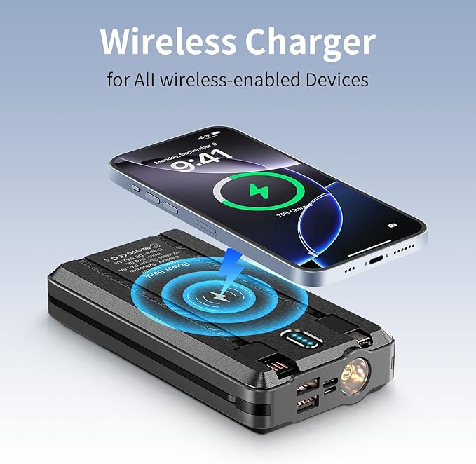 - 【Built-in Cable and Wireless Charging】: The power bank itself carries 3 output cables for Apple, Android, type-c, and one USB input cable. It also provides 2 USB output ports and 2 input ports (type-c and Android), which can be 5 at the same time. In addition, it also provides a wireless charging function, just put the mobile phone with wireless function on the back, and lightly press the power button to use it. Really one machine with multiple functions, fully satisfying daily life use.