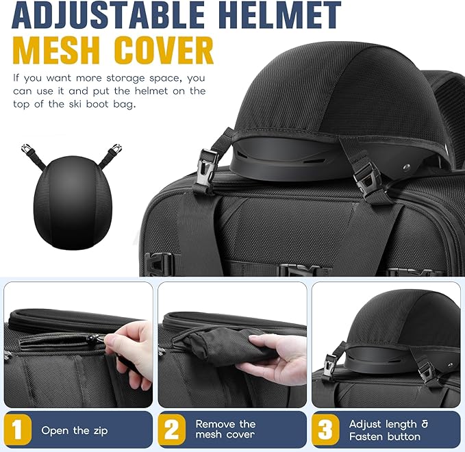 - Adjustable Helmet Mesh Cover Design: In order to save more storage space, we designed a hidden helmet mesh cover. When needed, you can open the zipper to take out the mesh cover and put the helmet on the top of the ski boot backpack. The adjustable buckle can be adjusted according to the size of the helmet, easily solving the capacity problem.