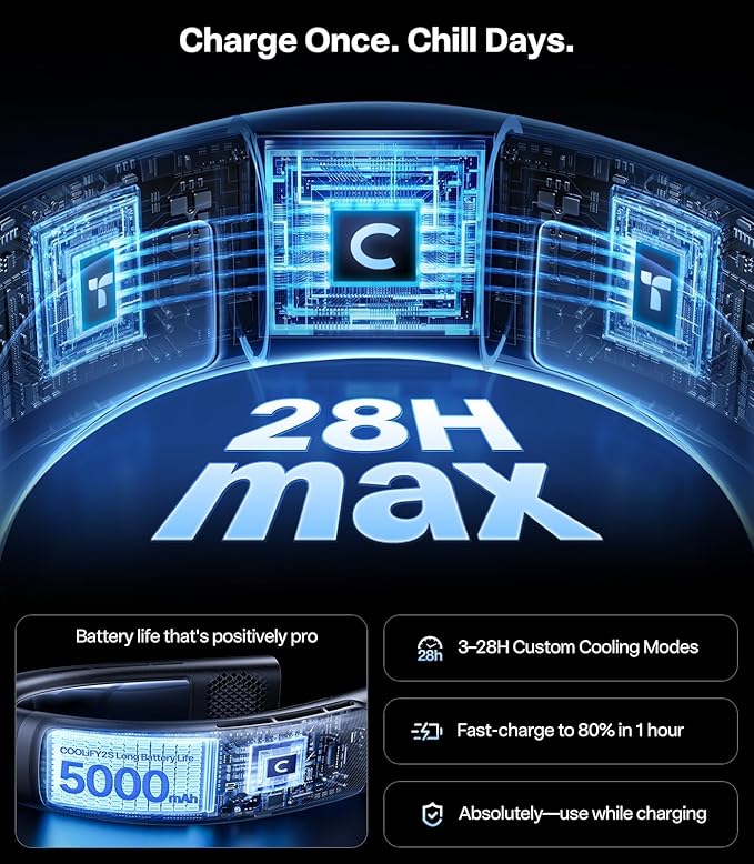 - [Unmatched Battery Life] The neck fan is equipped with a 5000mAh battery and features three modes: Cooling, Fan, and Heating. Enjoy 3–5 hours of cooling, 11–28 hours in fan mode, and 4–6 hours of gentle warmth. Whether you’re working outdoors, hiking, or commuting, stay refreshed without interruptions. With 20W fast charging, it fully recharges in just 2 hours, ensuring you’re always ready. Say goodbye to battery anxiety and embrace long-lasting comfort with it.