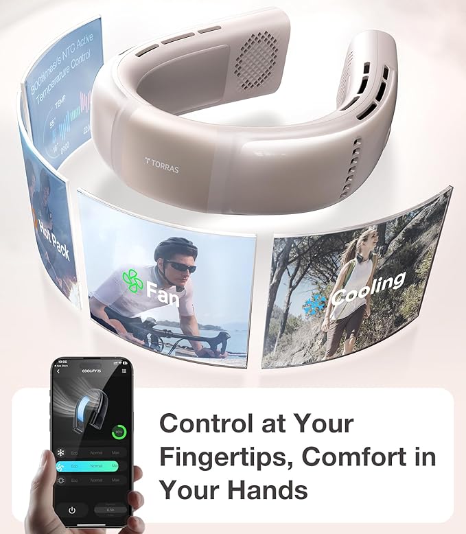 - [Multi-Mode for Year-Round Comfort] More than just a neck fan, it is a true 4-season wearable air conditioner with three intelligent modes: Fan Mode – Delivers a refreshing, natural breeze. Cooling Mode – Uses semiconductor cooling + airflow for instant chill. Heating Mode – Generates soothing warmth for cold days. Easily switch modes for personalized comfort in any season. With APP control, adjust settings and monitor battery life anytime for a smarter, more convenient experience