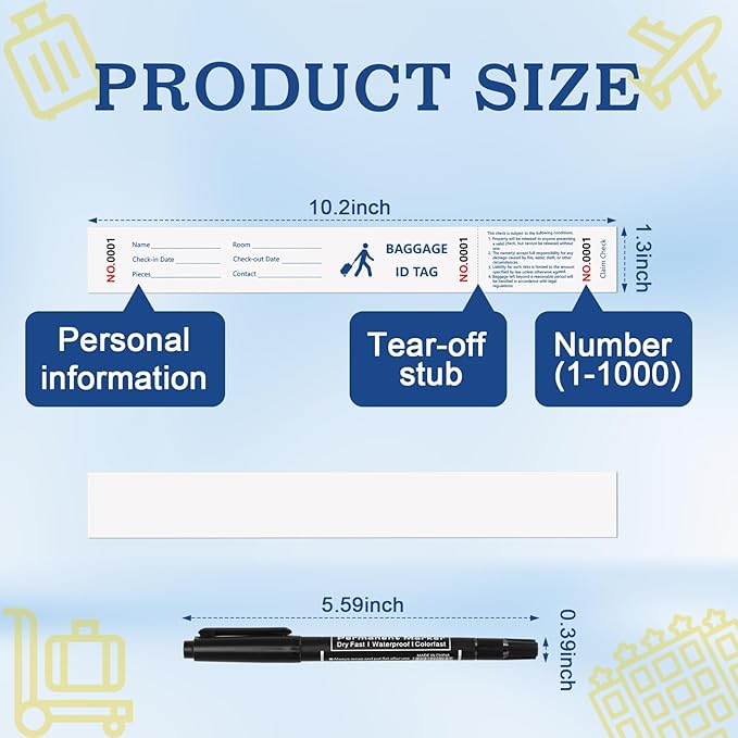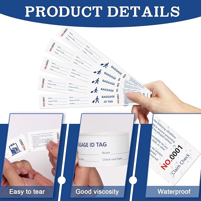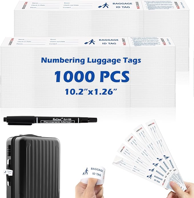- Effortless Organization: Our hotel luggage claim tags come in a convenient pack of 1000, each labeled with a unique number from 1 to 1000. Designed to simplify your baggage handling process, these tags enable you to efficiently manage and track luggage, making travel a breeze.