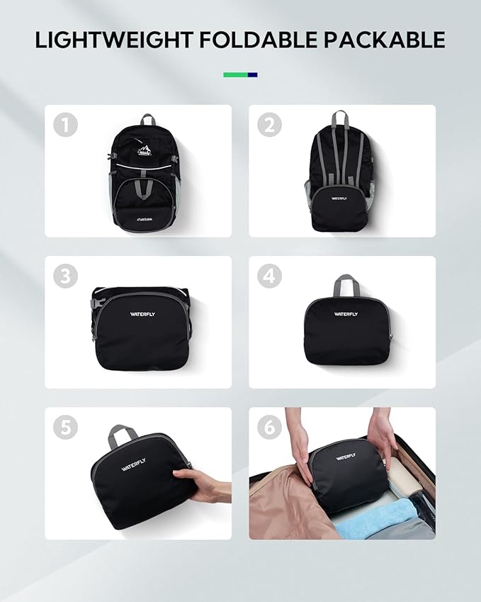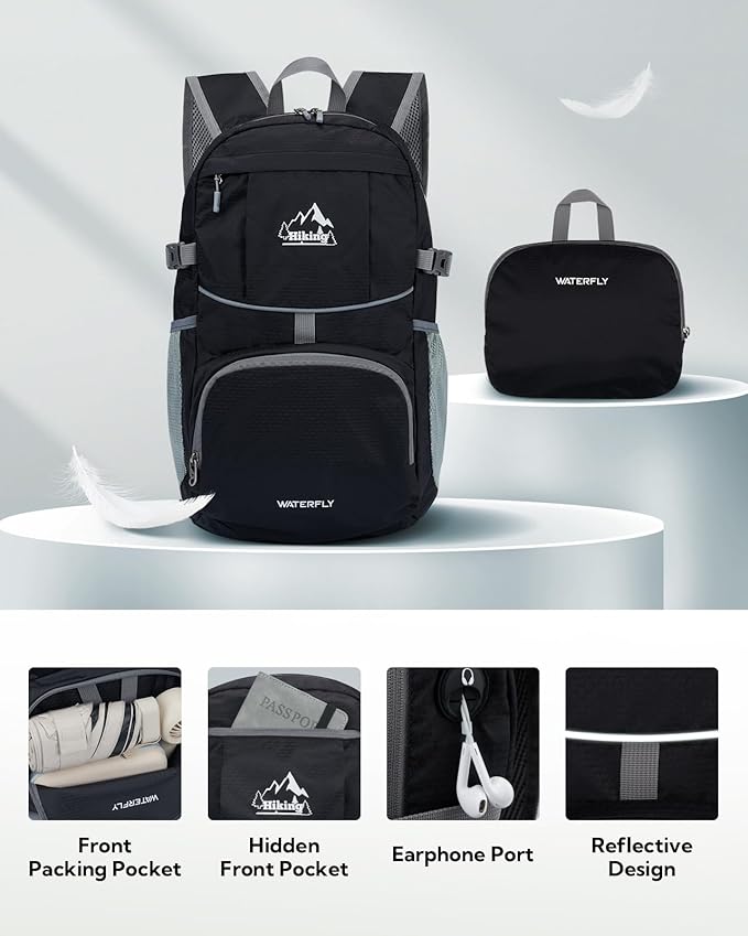 WATERFLY Hiking Packable Daypack Backpack: 25L Ultra Lightweight Day Pack for Woman Man - Small Compact Folding Back Pack for Outdoor Sport Cycling Camping Travel Trip - Black