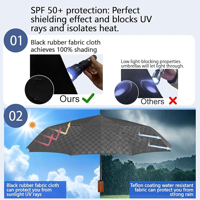 - 【High Quality & Unique Design】SATOL windproof golf umbrella has a wide canopy that provides abundant coverage. The travel umbrella is large enough to protect 2 people from the rain. The folding umbrella is made of a 310T teflon fabric that is fully water-resistant. This UPF 50+ Black rubber anti-UV fabric also gives you perfect shielding effect and blocks UV rays and isolates heat. The pattern is fommed by high temperaturedie-casting, permanently colorfast, safer and healthier.