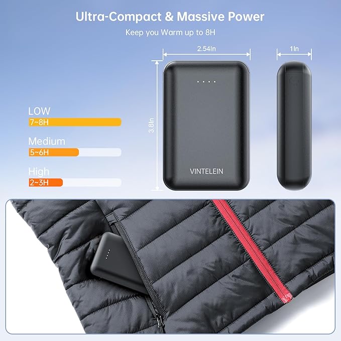 - 【Pocket Size & Massive Power】 Ultra-compact battery pack 10000mAh,37Wh fits in any pockets, weighs only 7.6 OZ, keep you warm up to 8 hours. Provides 2 full charges for iPhone 16. Note: 3.7V/10000mAh = 7.4V/5000mAh = 37Wh