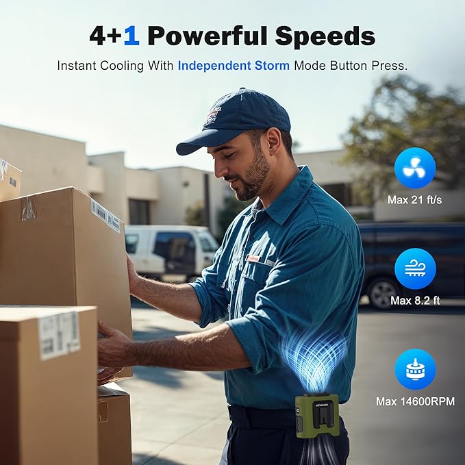 - Independent Storm Mode: With 4 wind speed settings and a dedicated storm mode, this personal fan delivers wind speeds up to 21 ft/s. Easily activate storm mode with a single press for fast cooling in hot outdoor work environments, morning exercises, or long journeys