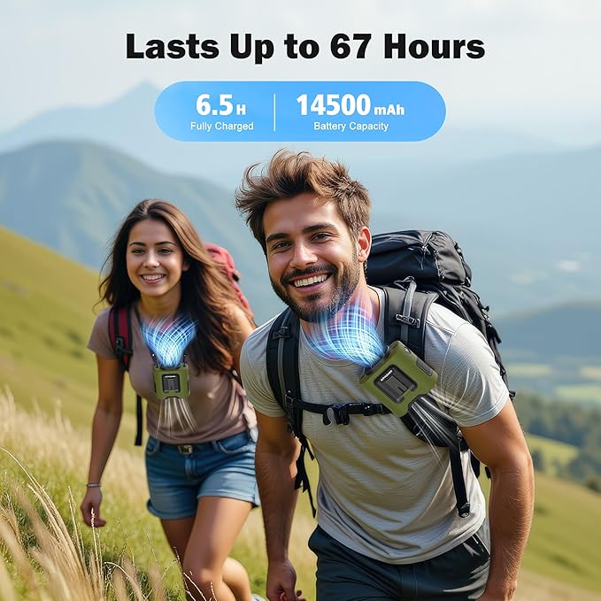 - Long-lasting Battery: The KITWLEMEN waist fan features a 14500mAh battery, providing up to 67 hours of continuous cooling on low speed, perfect for camping, hiking, and outdoor adventures to keep you cool