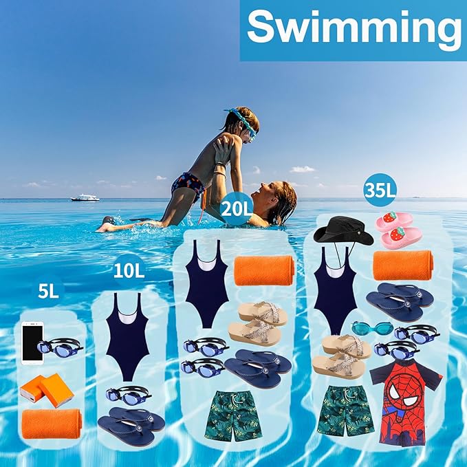 - Multiple options: We provide you with different sizes of 5L/10L/20L/35L. You can choose the appropriate capacity according to your needs.These different sizes of dry bags are lightweight dry bags, not heavier duty dry bags