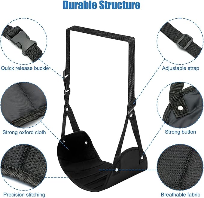 - 【Versatile Use】Easy to install with adjustable straps that can be attached to any seat tray, this foot rest for air travel is not only perfect for airplanes, trains, and cars but also ideal for use in the office, at home, under desk, or in hotels. This foot hammock for plane travel allows you to elevate your feet and provide support, relieving pressure on your lower back, knees, and hips, helping to alleviate leg stiffness and swelling from prolonged sitting and flying.