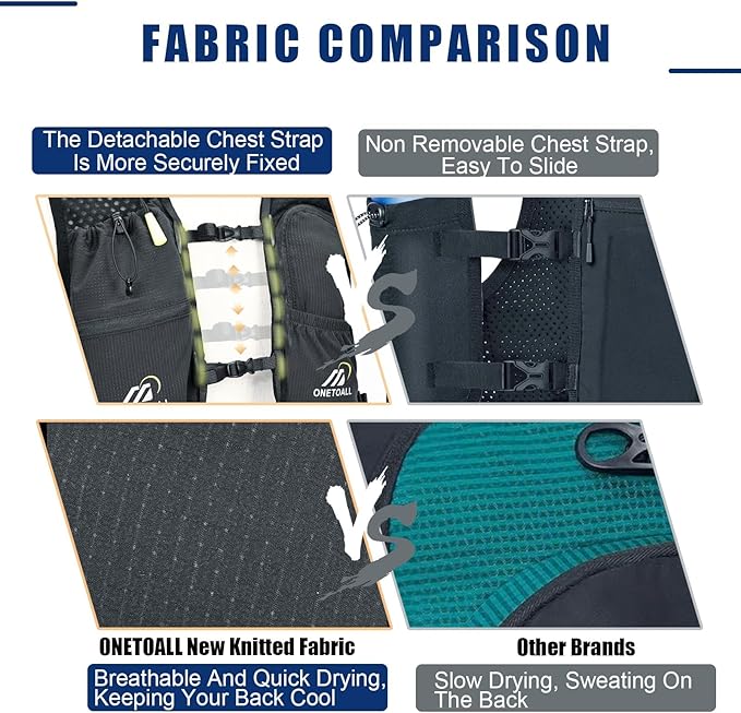 - ULTRA LIGHTWEIGHT UPGRADED FABRIC: ONETOALL hydration vest is made of the new knitted fabric and upgraded mesh fabric. And provide excellent breathability to keep your back cool and sweat free during exercise