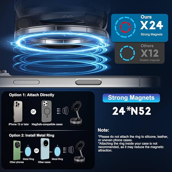 - Unmatched Magnetic Grip for Safe Driving: Upgraded with 24 N52 magnets in a dual-ring layout for ultra-strong, stable hold—even on bumpy roads. No signal interference. Designed for MagSafe iPhones and cases; includes magnetic rings for wider phone compatibility