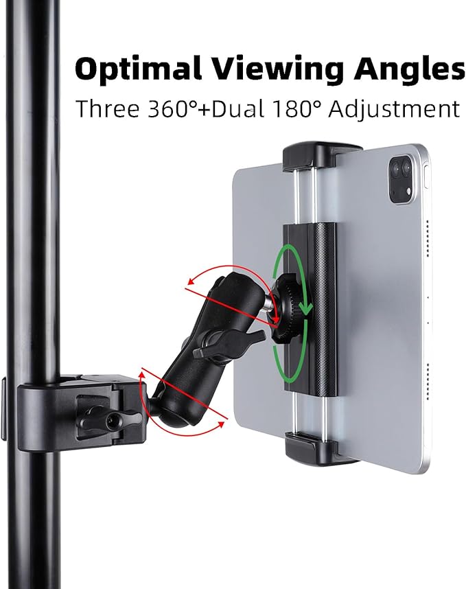 - **Easy Installation:** This iPad Holder Stand can be securely mounted on any tubular bar (0.47"-1.8") in your fitness space, making it perfect for use with spin bikes, treadmills, ellipticals, stationary bicycles, and other gym equipment, as well as compatible with microphone stands, tripods, strollers, and shopping carts. Installation takes only seconds.