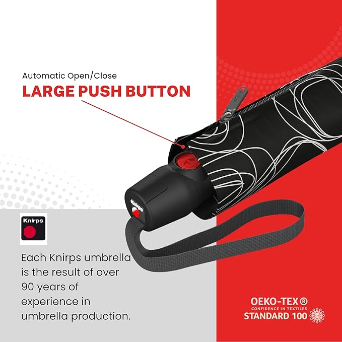 Knirps T.200 Duomatic Compact Rain Umbrella in Pure Black– Wind Tunnel Tested to 93 mph, Aluminum Steel Fiberglass Frame, 38in Canopy, OEKO-TEX, High-Performance Automatic Travel Umbrellas