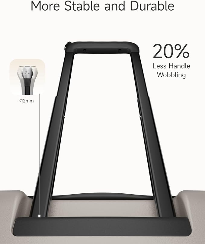 - Engineered Equilibrium – 10% Expandable Capacity, 100% Steady Glide. Our telescopic handle achieves a 12mm maximum wobble deviation, 20% outperforming the industry standard. Beyond that, the gravity-calibrated architecture of the LuggeX HUP3 suitcase maintains perfect load-stability harmony, eliminating wobbles even when fully packed – moving as one with your journey.