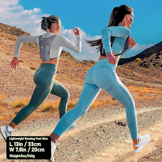 - [Breathable and Adjustable] Breathability is enhanced using lightweight mesh. Skin chafing is avoided by the race vest's soft shoulder strap edges. The chest clip can be slid up and down to a position that suits your body. Pull the waist webbing to a comfortable position and then fasten it with a black elastic tightening ring. This is suitable for both women and men runners. There's no need to worry about choosing the right size, as it's applicable to the whole family