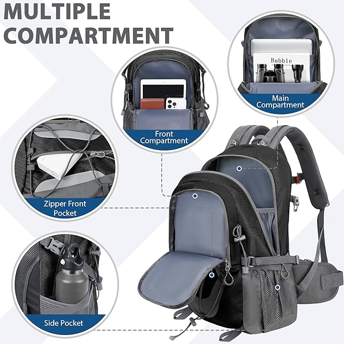 - Multiple Compartments for Organization: With multiple pockets and compartments, this camping backpack allows you to keep your items organized. You have quick and easy access to hiking essential