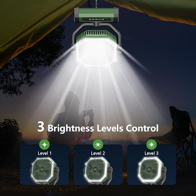 - 【Easy to use】Fan and LED lights are controlled separately. 4 speed lights and 4 battery lights show your current fan speed setting and remaining battery capacity. Press the sleep mode button to turn off the lights when you sleep and don't want to light up. The bottom has a 360° swivel table and foldable hooks to hang the tent fan wherever you want