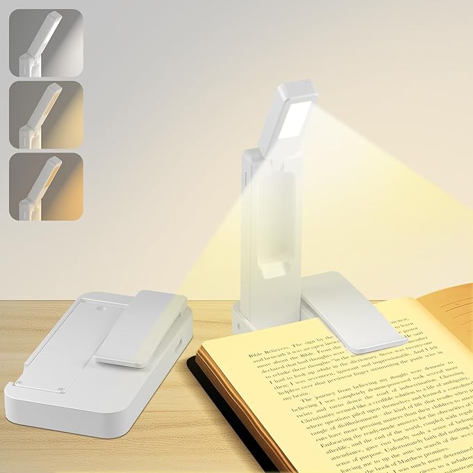 - 【Lightweight & Foldable Design】Ultra-thin/Folding/Compact/Portability.Weighing only 60g and the size of the palm of your hand, this ultra-lightweight LED book light features a compact clip-on and mini-folding design with a flat base designed to fit on a table, nightstand, or airplane tray table, and can be slipped into pockets and carry-on bags for travel, perfect gift reading lamp for book lovers, Students,Repairing,Camping and Reading on an airplane!