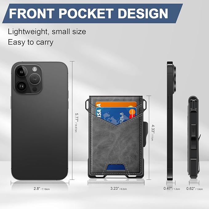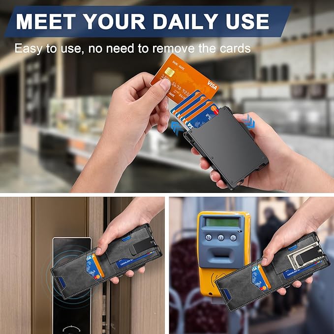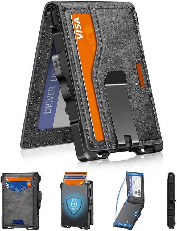 - UPGRADED DESIGN FOR QUICK ACCESS: GHUKY mens slim wallet combines high-quality leather and premium metal, featuring a smooth pop-up mechanism. The ergonomic design allows for effortless card retrieval with a gentle slide of the side button.