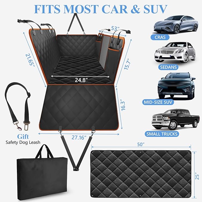 - 【Sturdy, Tough, Non-slip, No-Smell Fabric】Our backseat extender for dogs adopt upgraded quality material. 4x4 density of 600D Oxford cloth making the dog car seat cover stronger and easier to clean. PU coating is softer and no smell than other pvc layers. With TPU waterproof layer, double waterproof layer after testing will not leak to the car seat. The anti-adhesive bottom of dog hammock for car prevents your dog from slipping. Non-slip heavy duty zipper with lock, strong and sturdy.