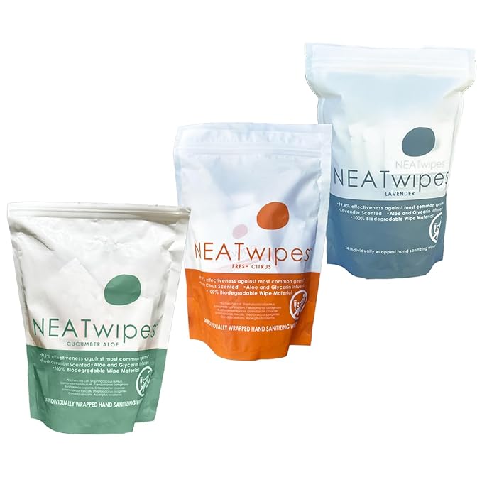 - DISPOSABLE TRAVEL SIZE WIPES: NEATwipes portable 24-count individually wrapped wipes come in a resealable bag and are perfect for on-the-go. Grab a handful for your pocket, purse, backpack or anytime you are on the go. Great for sharing with friends and customers.