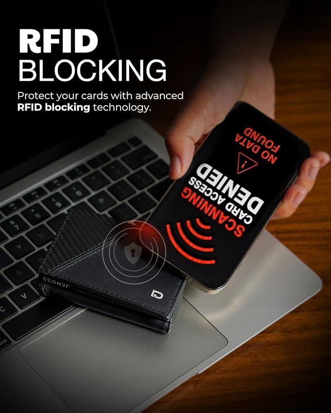 - 【 RFID Blocking Security 】 In today's world, identity theft is a growing concern. Jenoss comes equipped with cutting-edge RFID-blocking technology, creating a secure barrier around your credit cards, IDs license, and other sensitive information, ensuring your data remains safe from electronic pickpocketing. This protective feature makes it a must-have men's wallet for the alpha mens.