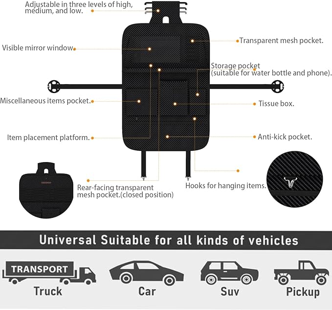 - ✔Stability and Easy Installation:Offers three different height settings, providing flexibility for various items and space requirements.This backseat organizer installation is pretty easy.It was designed for hassle free installation without the requirement of any tools.We have improved the adjustable buckle strap, plum buckles, aluminum hook plus strong straps ensures the great stability of the car seat storage organizer.