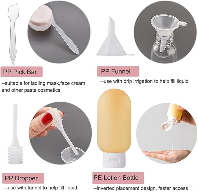 - 【CONSIDERATE MUST-HAVE TRAVELING SETS】12 packs leak proof travel bottles set, portable & lightweight, easy to carry & clean. You will get: 3 pcs 60ml (2.1 oz.) PE travel bottles + 1 pcs 80ml (2.8 oz. ) pump bottle + 1 pcs 50ml (1.8 oz. ) spray bottle + 1 pcs 30ml (1 oz. ) flip-cap bottle + 2 pcs 10ml (0.35 oz. ) cream jars + one pipette + one funnel + one spatula + one zip pouch. Perfect companion for your travelling!