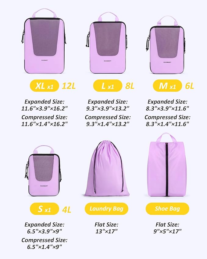 - Compression Packing Cubes - Are you fed up with the travel kind of messy suitcase? Travel with BAGSMART PACKING CUBES and they make a world of difference. The 6-piece packing cubes contains 4 travel cubes + 1 laundry bag + 1 shoe bag, keeps your outfits in separate compression cubes, and makes your luggage clean and neat while traveling