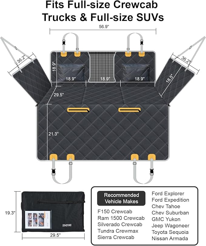 - Extended Activity Space: Our car hammock (56.9”W x 29.5”D) prevents footwell sliding, expands space by 40%, and ensures safety for movement and stretching to ease travel anxiety. Offers full rear-seat coverage, ideal for large breeds, older dogs, or multi-dog households.