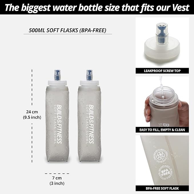 - 8 POCKET STORAGE – Equipped with 8 pockets for all your running essentials. Includes 2x front bottle pockets (NOTE: compatible with 300ml Build & Fitness water bottles or 500ml soft flasks). 2x lower front zipper pockets for phones up to 6.1” inch. 2x upper front zipper pockets for Keys, Cards, Snacks, EarPods. 1x back zipper pocket ideal for a lightweight jacket, running cap, towel. 1x open-access pocket, ideal for our 1.5L Hydration Bladder, max size: 17x28cm.