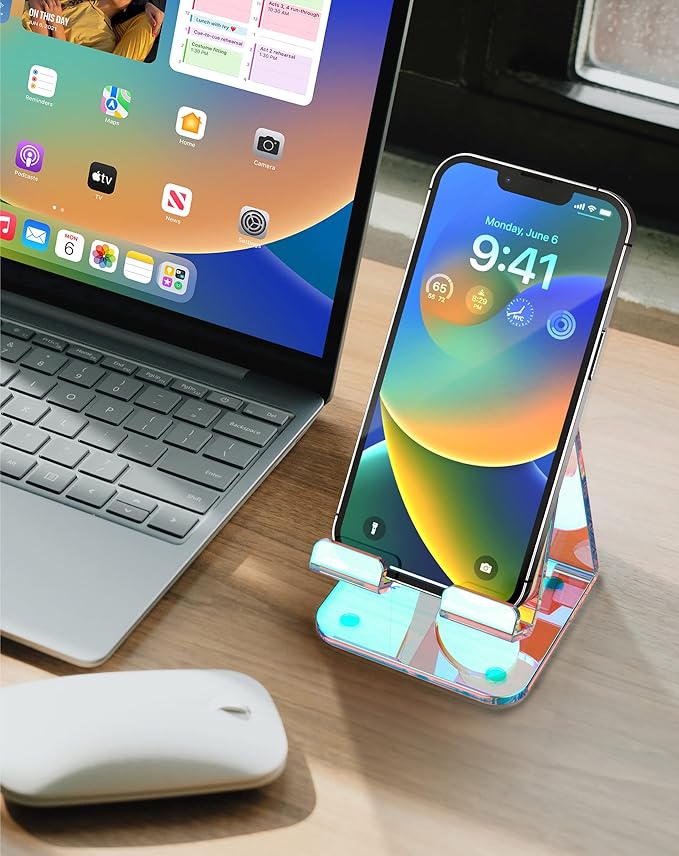 TOPGO Acrylic Phone Stand, Clear Phone Holder for Office Desk, Vanity, Kitchen Counter, Bedside Table, Compatible with iPhone 17 16 15 14 13 12 Pro Max Plus/Smartphones/iPad/Switch - Iridescent Color