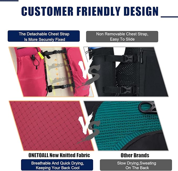 - ULTRA LIGHTWEIGHT UPGRADED FABRIC: ONETOALL hydration vest is made of the new knitted fabric and upgraded mesh fabric. And provide excellent breathability to keep your back cool and sweat free during exercise