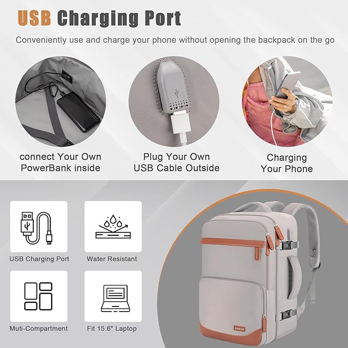 - 🔌【USB Charging Port – Stay Powered Anywhere】Equipped with a built-in USB charging port, this travel laptop backpack allows you to charge your devices on the go. Simply connect your power bank inside and plug in your cable externally – ideal for daily commutes, business trips, or long flights