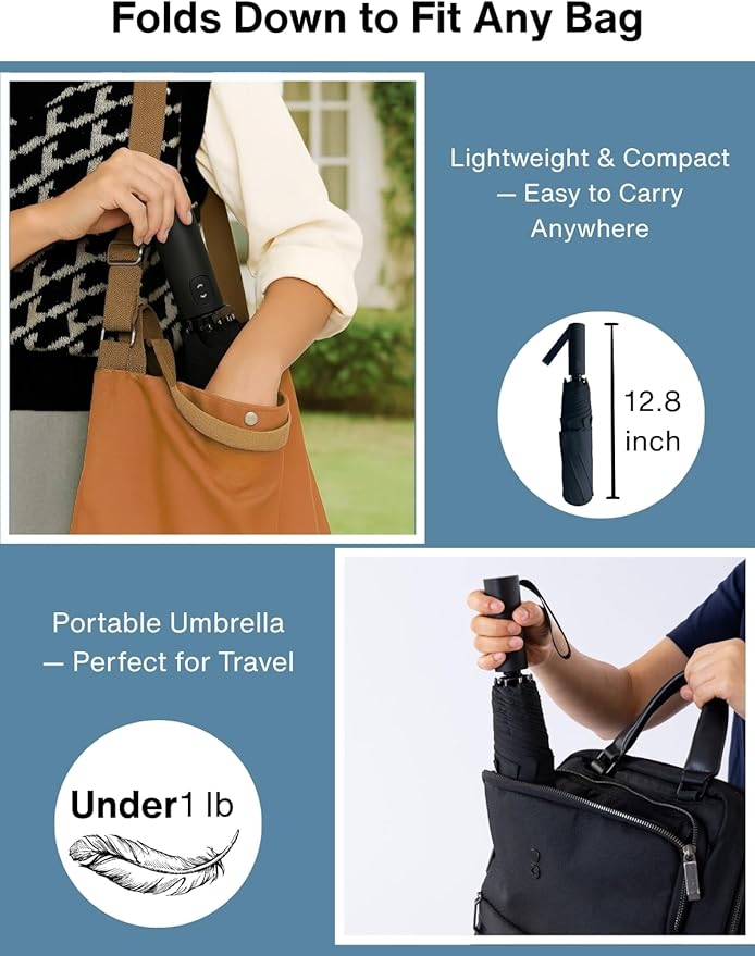 - 【Large Coverage, Small Footprint — The Ultimate Travel Essential】This travel-size umbrella opens to a 46-inch arc and 40-inch diameter, offering generous coverage to keep you and your surroundings dry. When folded, it’s just 12.6 inches long and weighs 0.9 lbs — compact and easy to carry. Its lightweight design fits in your backpack, purse, carry-on, car, or suitcase, making it a true travel essential. Though small when folded, it delivers strong storm protection and is durable enough for daily use. Whether commuting, traveling, or on the go, this umbrella is your perfect weather companion.